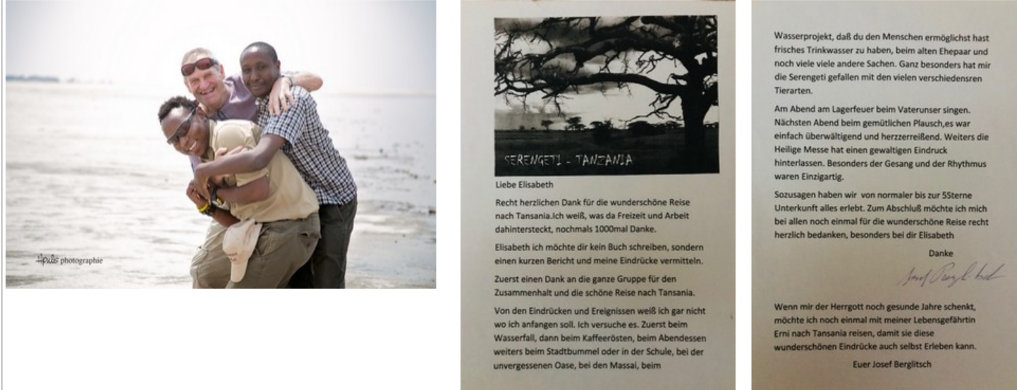 Liebe Elisabeth, ich danke dir für eine wunderbare Reise, die mit einer herkömmlich gebuchten Reise nicht zu vergleichen ist. Es war das Herz Afrikas, dass wir mit dir erleben durften. Ich bedanke mich auch bei unseren wunderbaren Guides, Deus, Deko und Luis. Sie haben uns sicher und mit viel Ruhe durch diese Reise begleitet. Ich werde sie nie vergessen und ich glaube, wir werden uns wieder sehen!!!